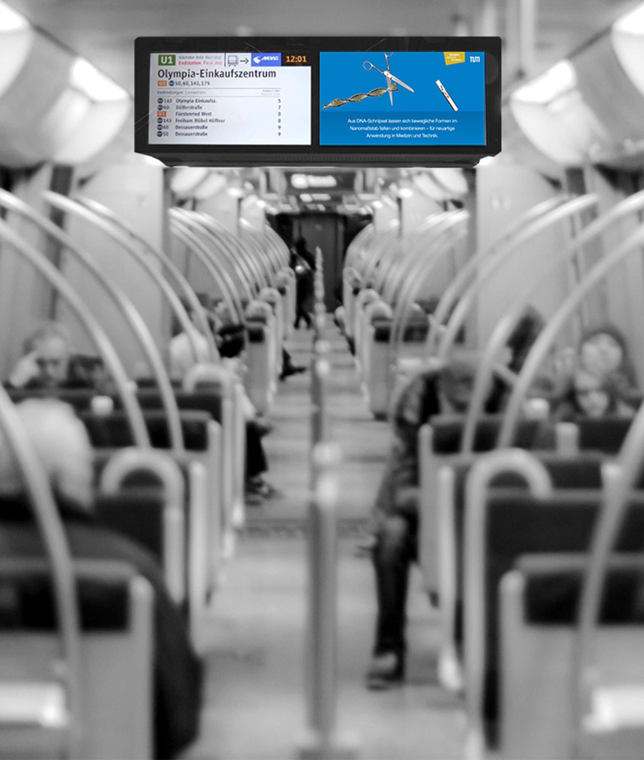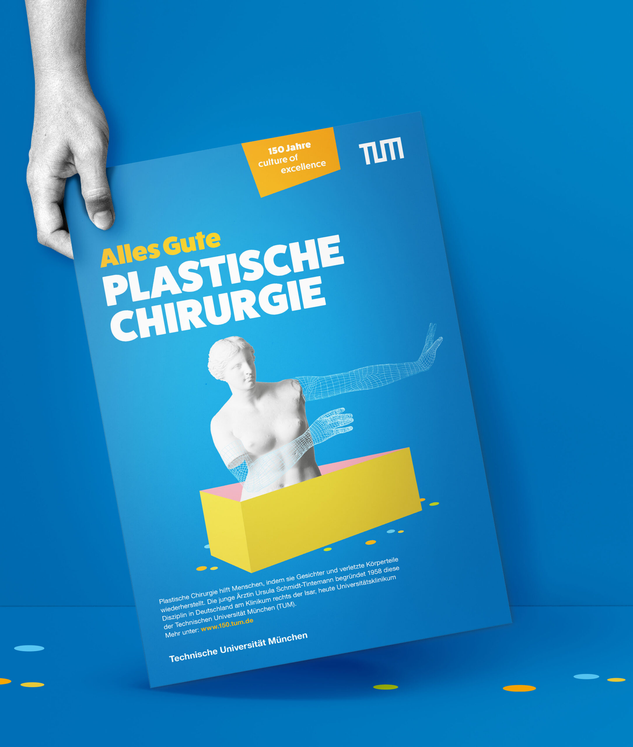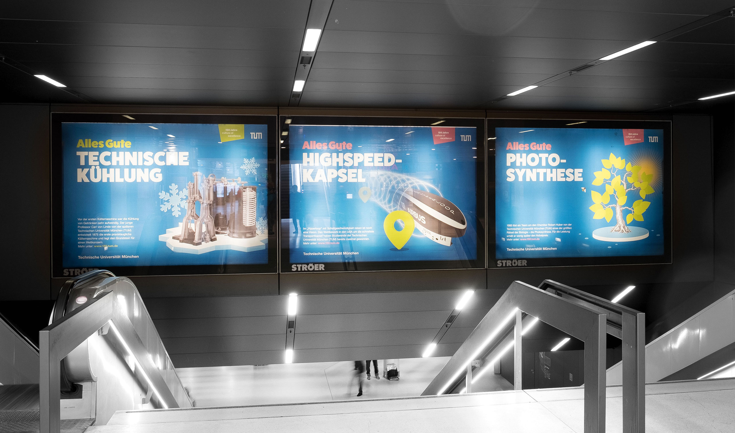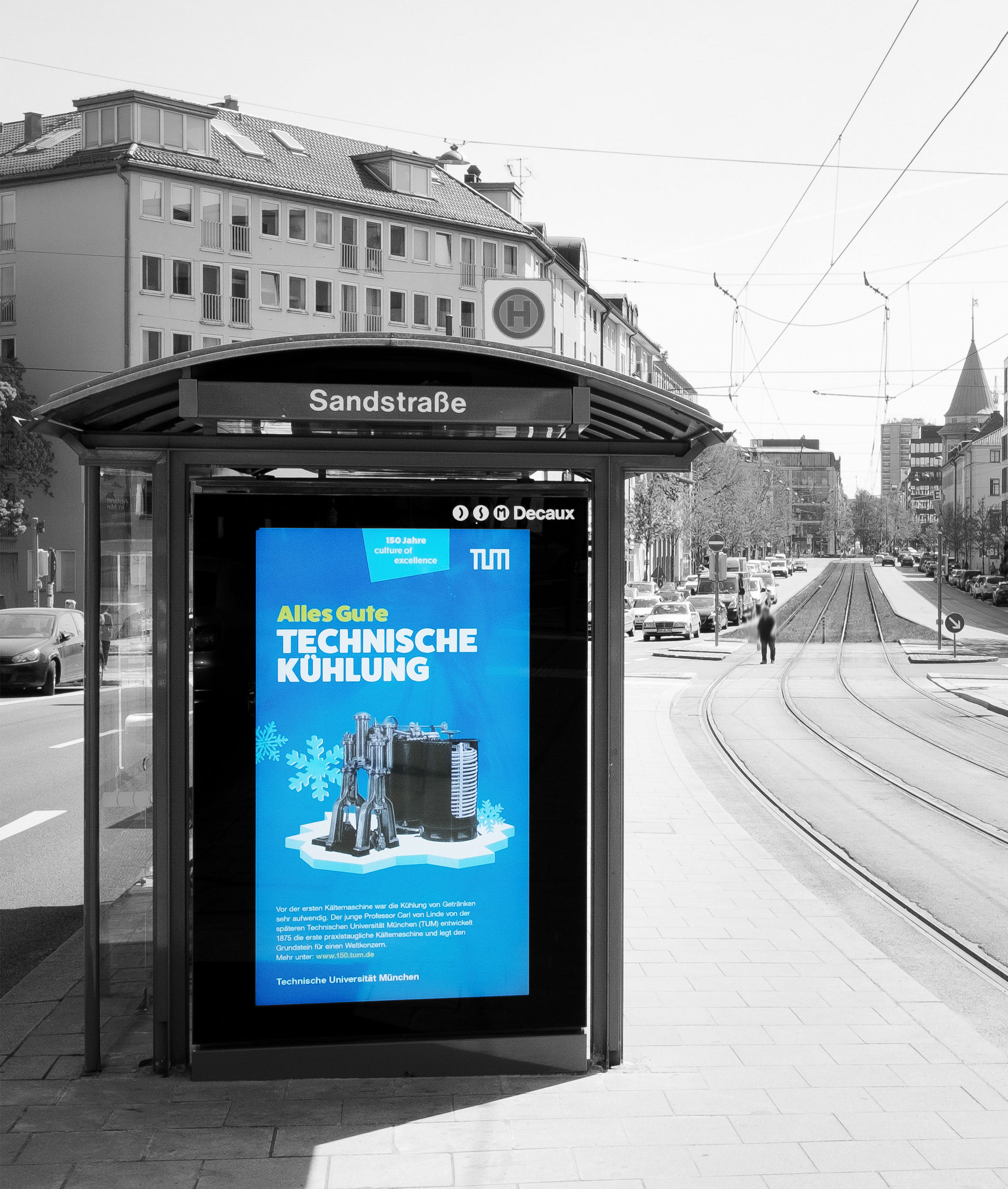 In der Kampagne wurden nicht die Personen, sondern die außergewöhnlichen Leistungen und Errungenschaften in den Mittelpunkt dargestellt. Damit wurde Neugier auf mehr Informationen zu den Themen geweckt, die auf der Jubiläumswebseite 150.tum.de beantwortet wurde. Die Geschichten wurden ebenfalls im Collagendesign gestaltet und per Videos, Floorprints, City-Lights und Großflächenplakaten in drei großen Kampagnen-Wellen in der Münchner Innenstadt gespielt.