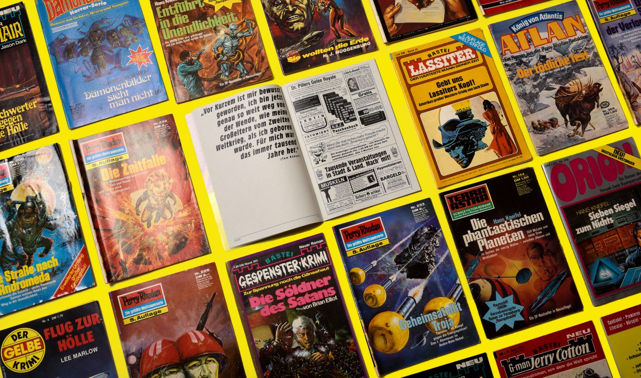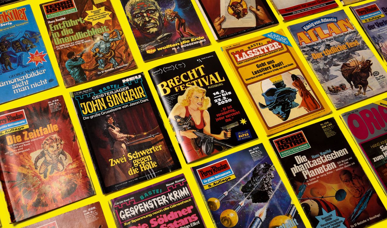 Dem diesjährigen Festival-Design liegt Brechts Dreigroschenroman zu Grunde. Wir greifen hierfür den Stil von Pulp-Magazinen und populären Kriminalheftchen aus den Sechzigerjahren auf. Auf dem Cover eine schwerbewaffnete Blondine im roten Kleid, im Programm eine wilde Mischung aus typografischen Stilen und trashigen Layoutelementen; Programmpunkte, die sich gegenseitig lautstark überbieten, banale Kleinanzeigen, welche mit den eigentlichen Veranstaltungsinformationen um die Aufmerksamkeit der Betrachter*innen buhlen. Ein Brechtfestival wie ein trunkener Abend auf dem Plärrer – ein einziges Spektakel.