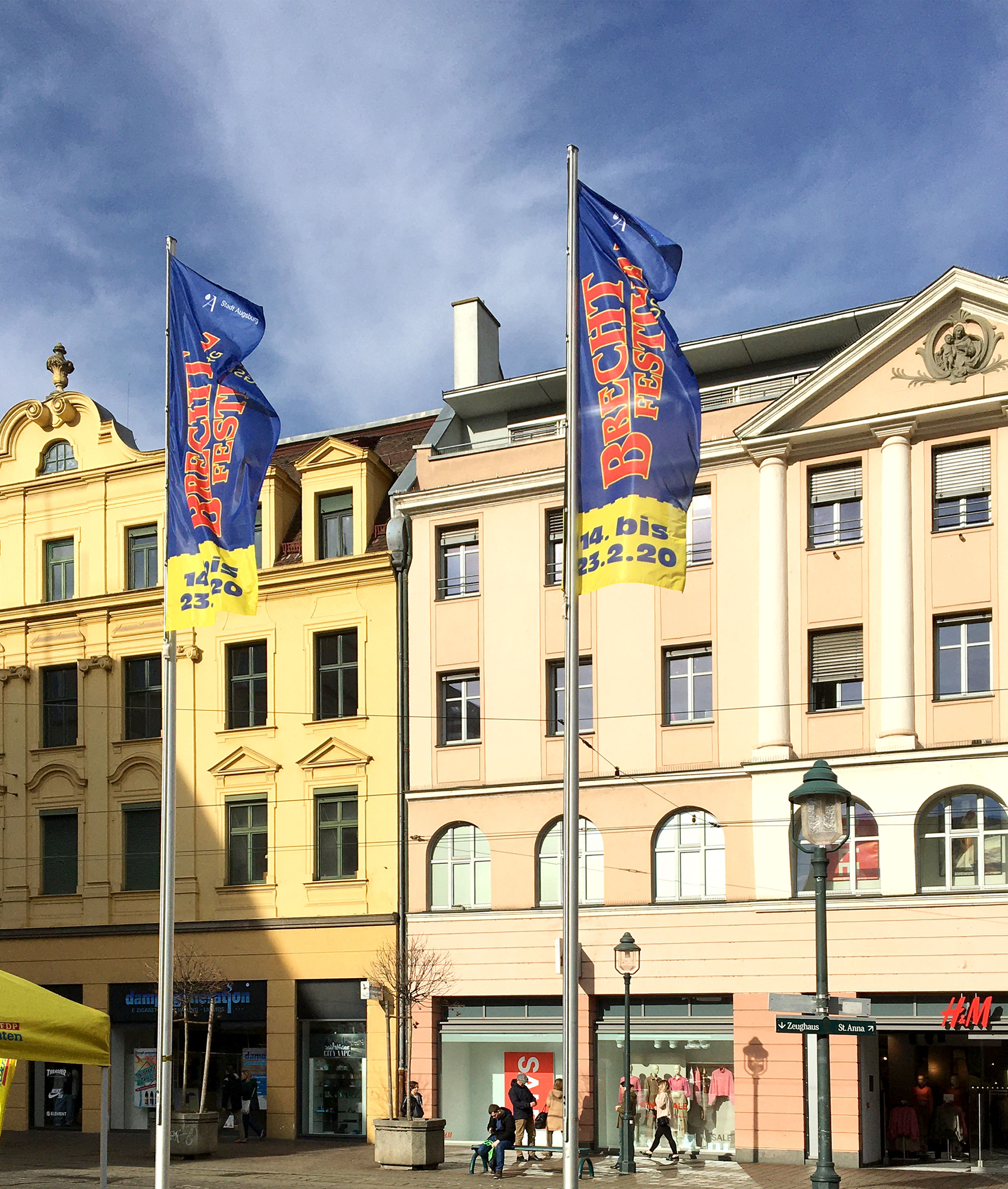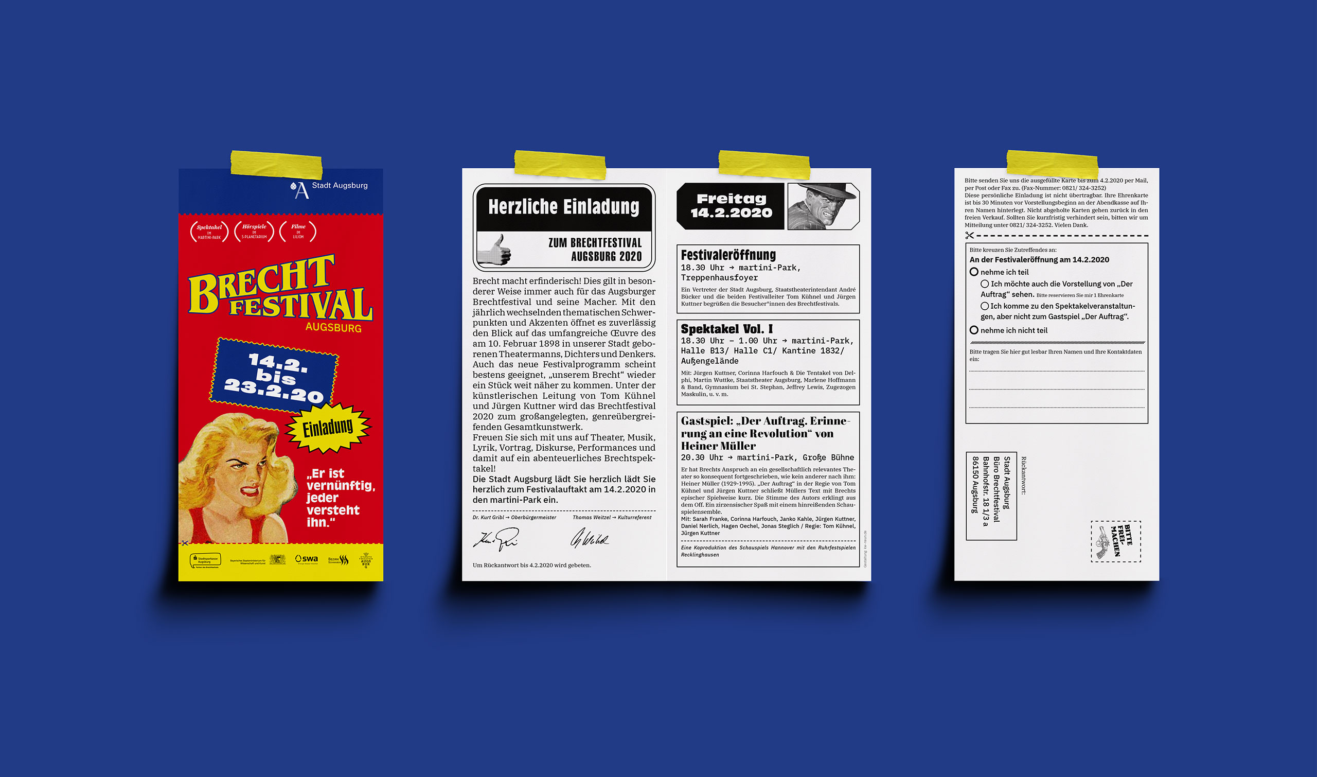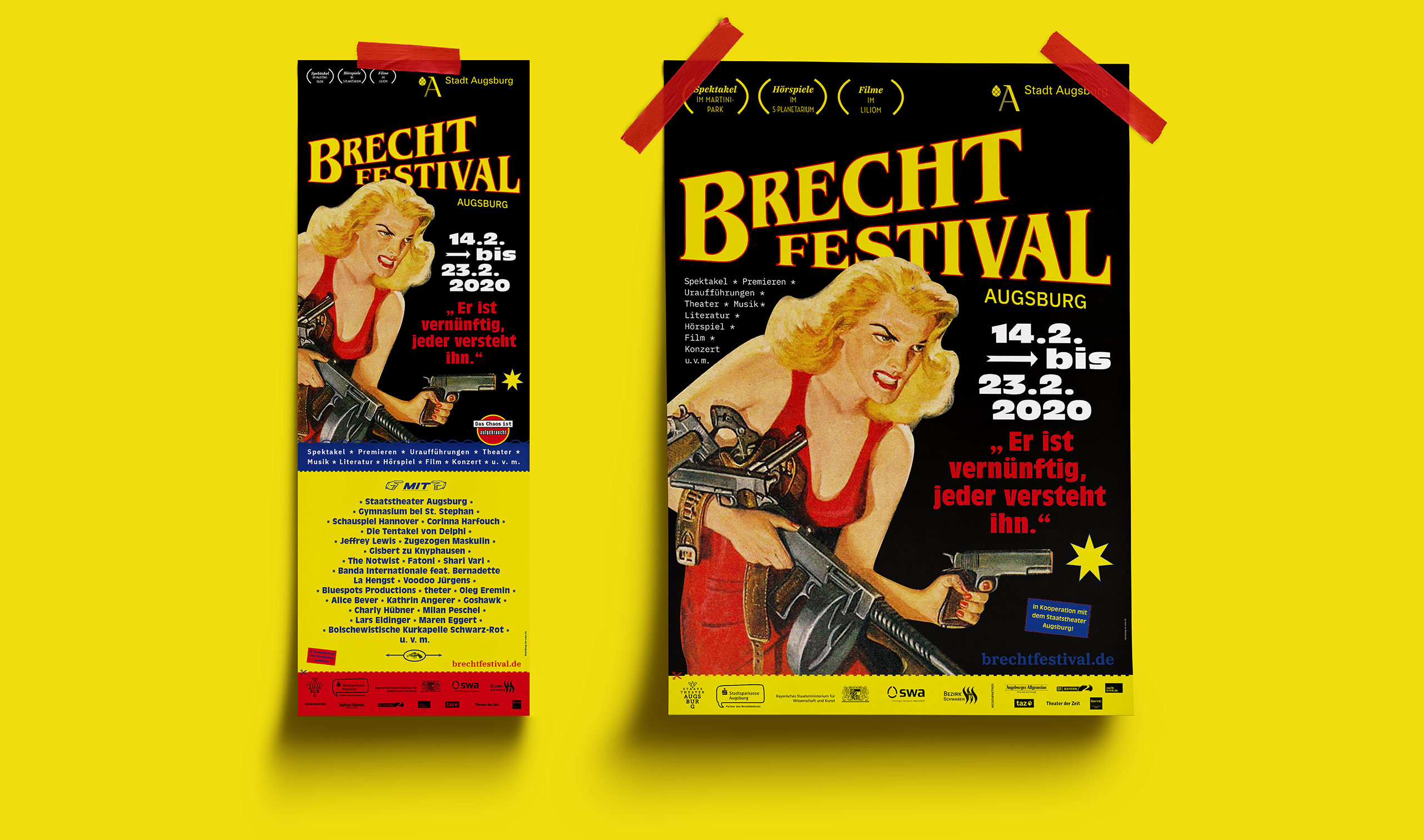 Theater, Literatur, Musik und Diskurs. Mit dem Brechtfestival feiert Augsburg auch 2020 seinen großen Sohn. Diesmal jedoch unter neuer künstlerischer Leitung. Mit ihrem „Spektakel“ möchten Tom Kühnel und Jürgen Kuttner Brecht vom Sockel eines verstaubten Klassikers holen. Jegliche Berührungsängste sollen niedergerissen werden, keine museale Glorifizierung soll von Aktualität und Relevanz des Künstlers, dessen Werk und Wirkung ablenken. Die Aufgabe für uns Gestalter wurde klar ausgegeben: Brecht ist für alle. Brecht ist laut, bunt und plakativ. Brecht ist Spektakel.