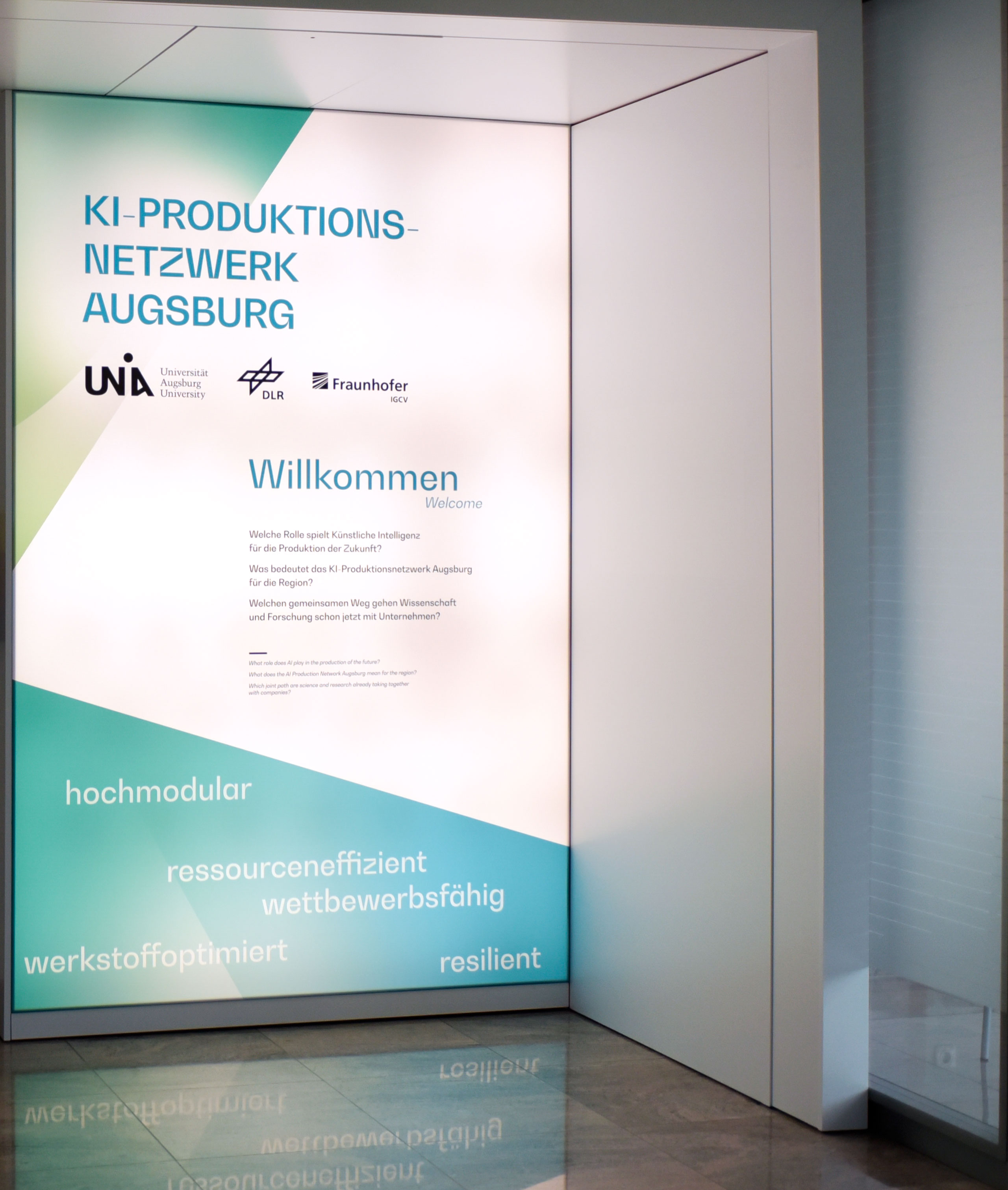 Künstliche Intelligenz (KI) ist einer der heutigen Innovationsbeschleuniger. Augsburg spielt eine gewichtige Rolle bei der Erforschung von KI-gestützte Lösungen für eine zukunftsfähige, hochmodulare und werkstoffoptimierte Produktion. Im KI-Produktionsnetzwerk Augsburg erproben und validieren die Kernpartner Universität Augsburg, das Fraunhofer IGCV sowie DLR ZLP gemeinsam mit der Hochschule Augsburg und regionalen Industriepartnern dabei nicht im Labor, sondern auf 5300m² und dies in zahlreichen Kooperationen mit Unternehmen. Ziel ist es, die industrielle Fertigung mittels KI wandlungs- und anpassungsfähig zu machen und die gegebenen Ressourcen optimal zu nutzen.